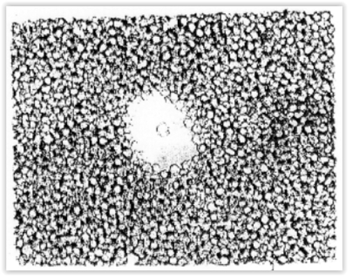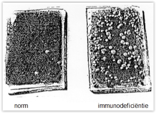 Fig. 1 toont een microfoto van een auto-antilichaam-synthetiserende cel die autohemolysinen produceert. De centrale cel is omgeven door een transparante zone (“plaque”) van hemolyse, waarvan de waarde afhangt van de intensiteit van het auto-immunisatieproces. Het normale aantal van dergelijke cellen bij mensen en zoogdieren is ongeveer 3% (bij kinderen in de eerste levensweken kan dit lager zijn).