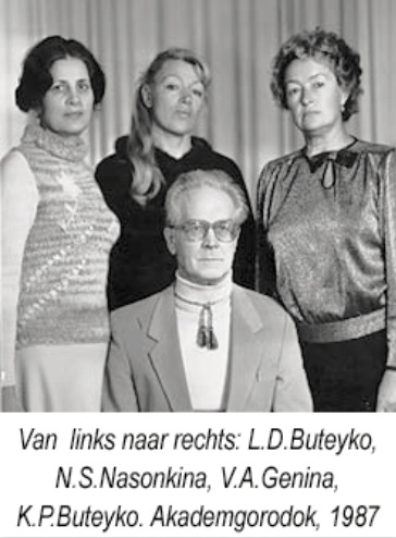 Zo heb ik hem leren kennen. Ik was ernstig ziek, ik had een zware hormoonafhankelijke vorm van bronchiale astma en daarnaast nog een gezwel in mijn borst, cysteuze mastopathie. Op de leeftijd van 29 jaar was ik volkomen invalide. Ik kreeg enorme doses hormonen en als gevolg daarvan had ik snor- en baardgroei en mijn gewicht was 120 kg. Ik had het voortdurend benauwd en alle ambulanceteams van Moskou kenden mij van gezicht. Het grootste deel van het jaar verbleef ik in ziekenhuizen. Ik heb zo vaak de dood gezien. Mijn situatie was triest, al mijn familieleden en kennissen probeerden de weg te vinden om mij te helpen, zij zochten naar alle mogelijkheden om mij te redden. En toen, dit was in 1968, kreeg ik een krant in handen met een artikel over Buteyko. Ik begreep dat dit mijn kans was en ik heb meteen een brief naar hem geschreven: “Aan dokter Buteyko. Novosibirsk”, zonder adres! Later kwamen zulke brieven probleemloos bij de dokter, maar mijn brief keerde toen terug. Met grote moeite heb ik het precieze adres van Buteyko gevonden en ik heb weer aan hem geschreven. Na een zekere tijd kreeg ik een telegram: “Ik zal op doorreis in Moskou zijn en ik kan u bezoeken”. Op 9 februari 1969 belde hij aan mijn deur. Ik vier ieder jaar deze datum die mijn leven heeft omgekeerd, dit is als mijn tweede verjaardag…